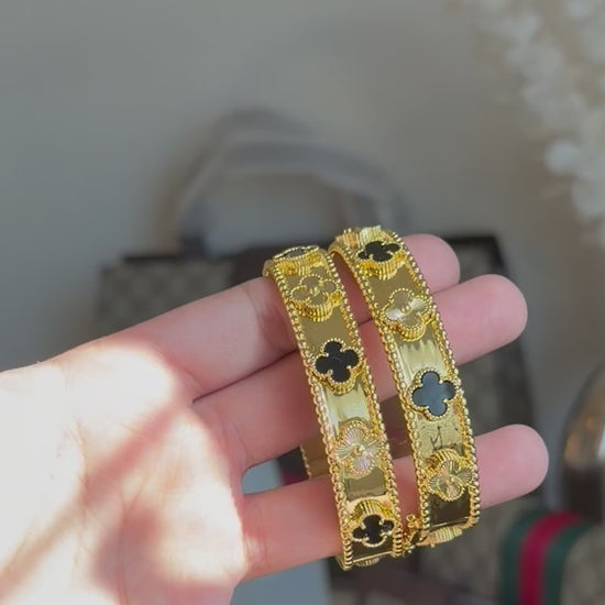 Enhance your style with our luxurious black and golden clover bracelet. Made with 32k gold plating, this bracelet adds a touch of elegance and sophistication to any outfit. Its unique design and quality materials make it a must-have for any fashion-forward individual. Elevate your look with our beautiful clover bracelet today.